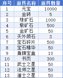 单日真实充值每满1000元,可任选以下表格中一份奖励道具(十三选一)。